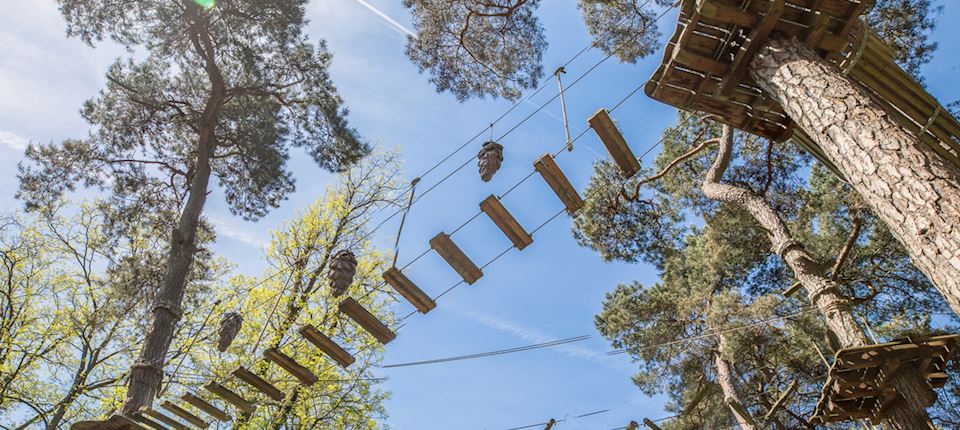 Ein Abenteuerspielplatz in luftiger Höhe mit fünf verschiedenen Kletterparcours, rasanten Seilbahnen und wackeligen Brücken zwischen den Baumwipfeln. Ein echtes Abenteuer für Groß und Klein!