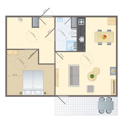 - Angepasstes Schlafzimmer mit zwei Boxspring-Einzelbetten, Softtopper, Platz für ein Hoch-/Tiefbett und Platz neben einer Seite des Bettes mindestens 90 cm und einem Rollstuhlwendekreis von mindestens 150 cm