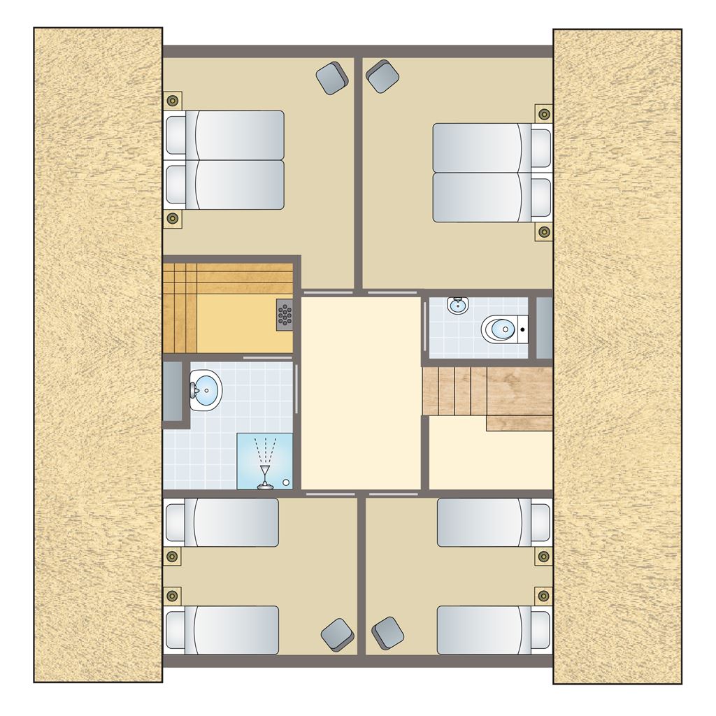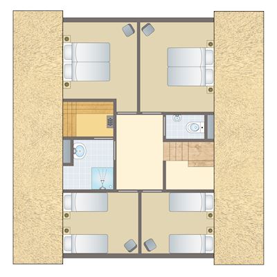 - Vier Schlafzimmer mit jeweils zwei Boxspring-Einzelbetten auf der ersten Etage