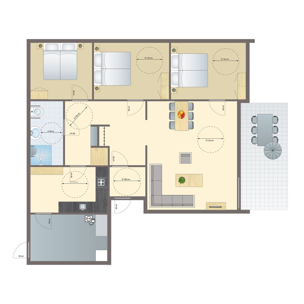 - Angepasstes Badezimmer mit ebenerdiger Dusche, festem Duschsitz mit Armlehnen, verstellbarem Duschkopf, angepasstem Waschbecken, verstellbarem Spigel und einem Rollstuhlwendekreis von mindestens 100 cm