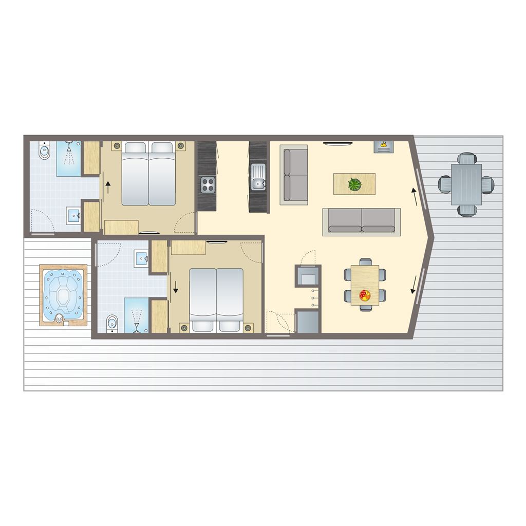 - Zwei Badezimmer (vom Schlafzimmer begehbar) mit ebenerdiger Dusche und WC