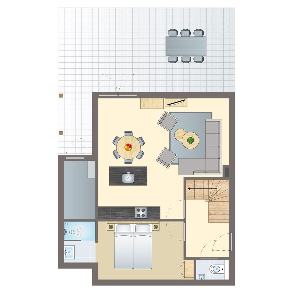 - Badezimmer (vom Schlafzimmer begehbar) mit ebenerdiger Dusche, Waschbecken und WC auf der ersten Etage