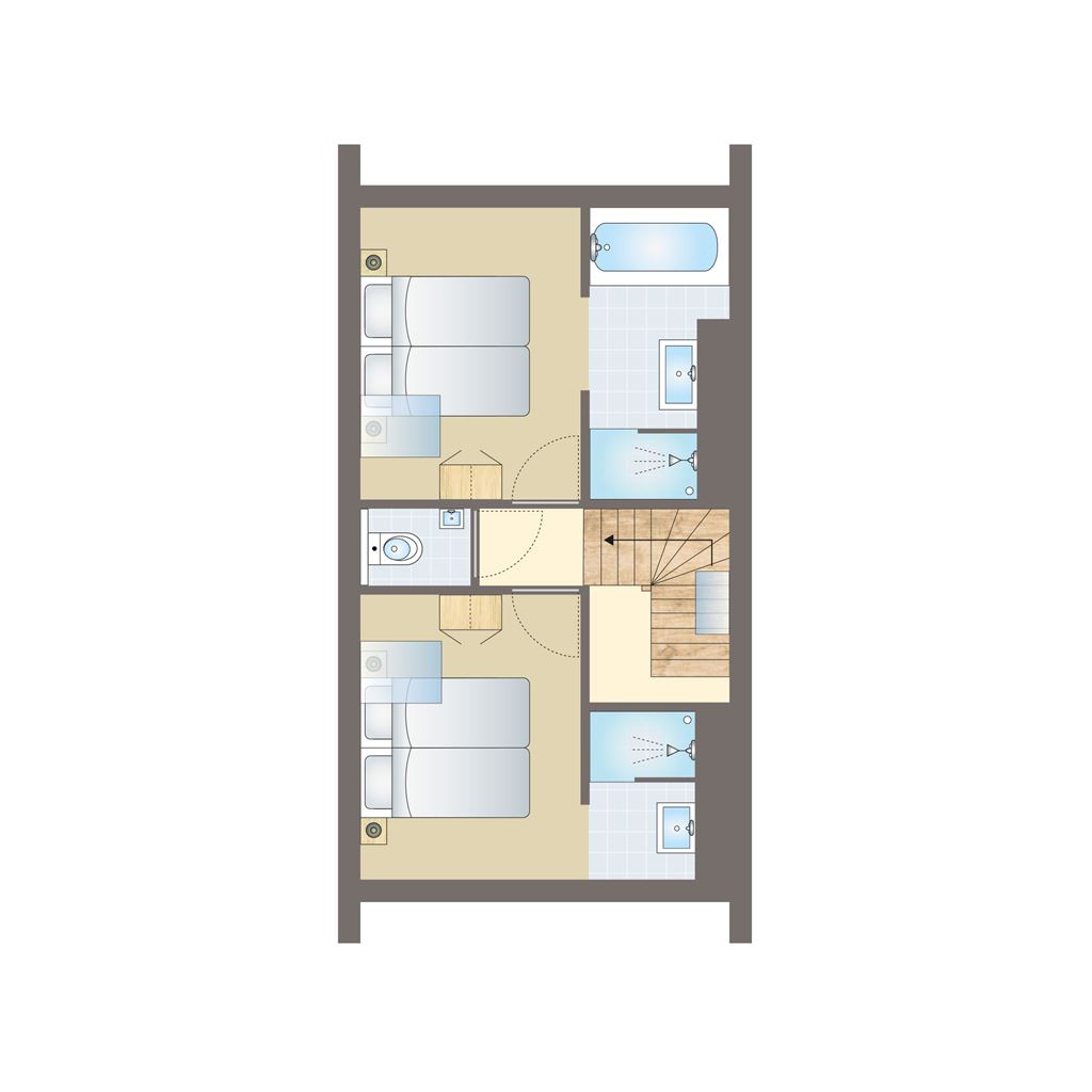 - Zwei Schlafzimmer mit jeweils zwei Boxspring-Einzelbetten auf der ersten Etage