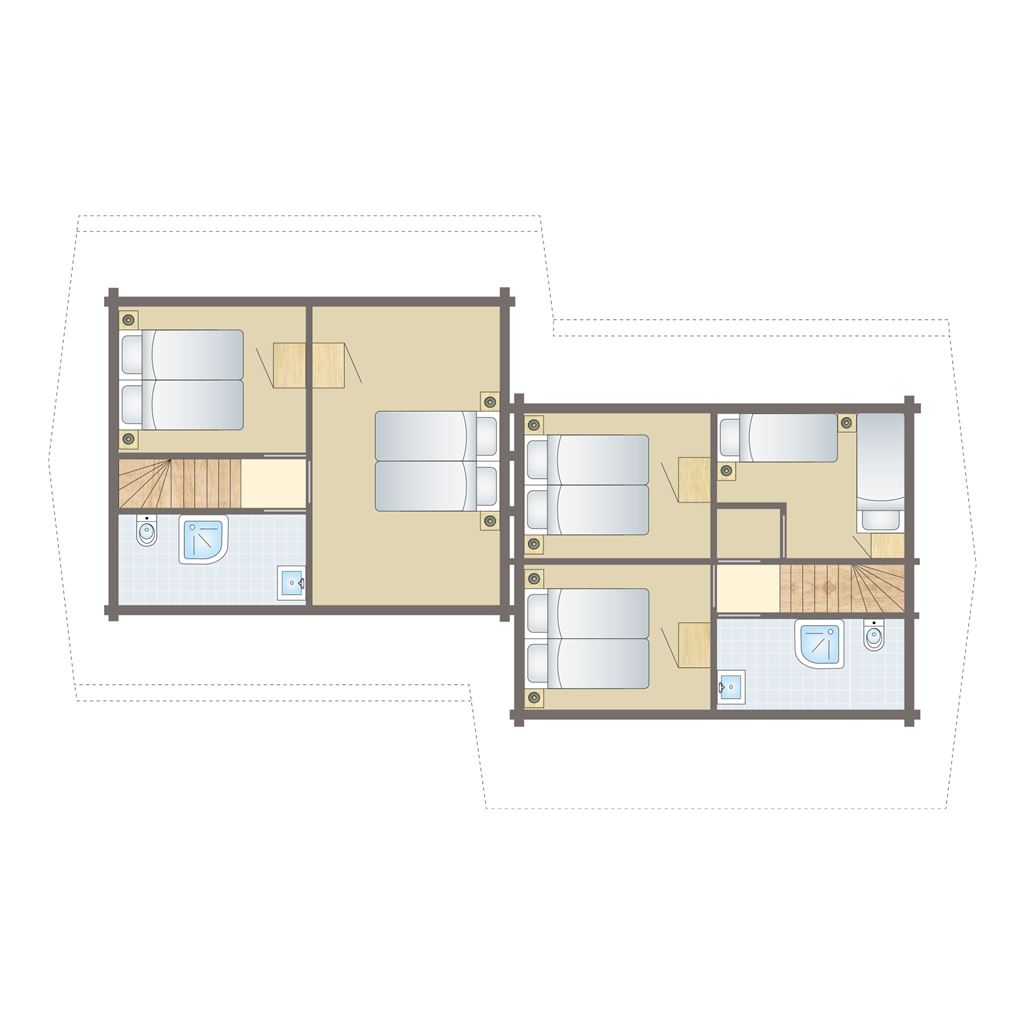 - Fünf Schlafzimmer mit jeweils zwei Boxspring-Einzelbetten auf der ersten Etage