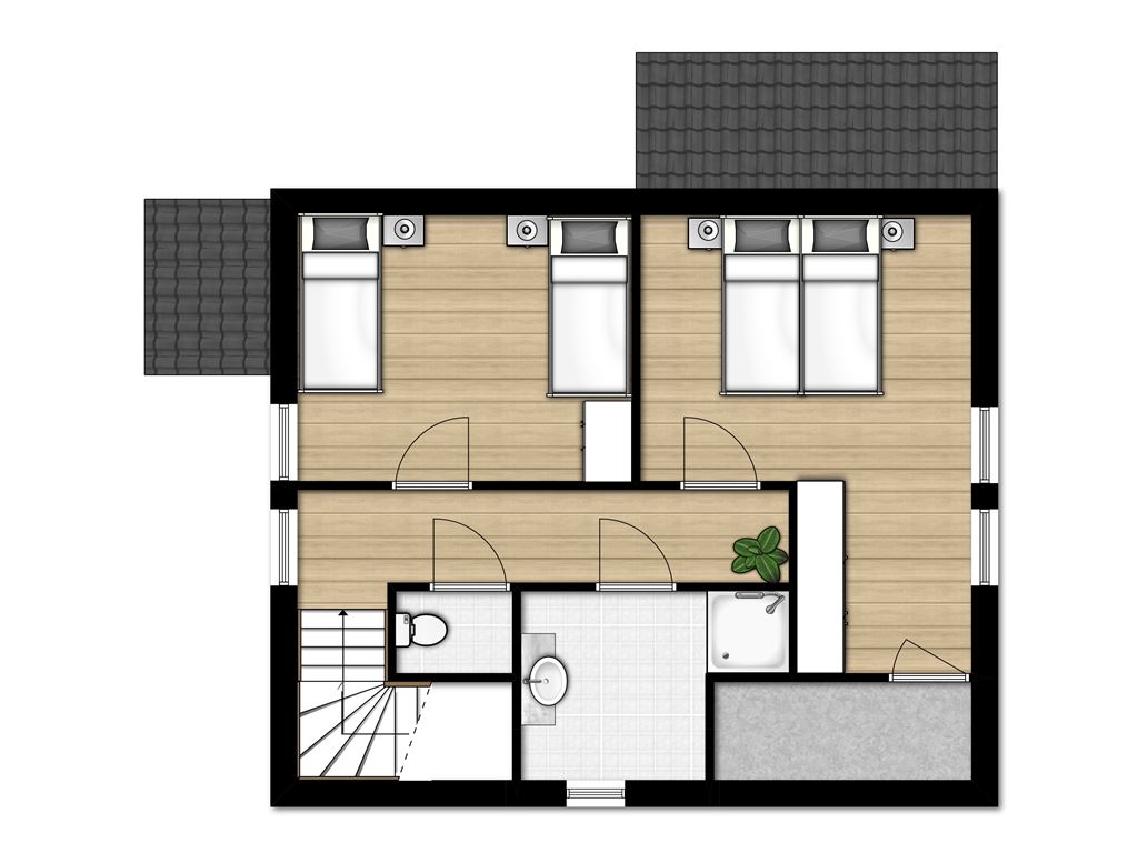 - Zwei Schlafzimmer mit jeweils zwei Boxspring-Einzelbetten auf der ersten Etage