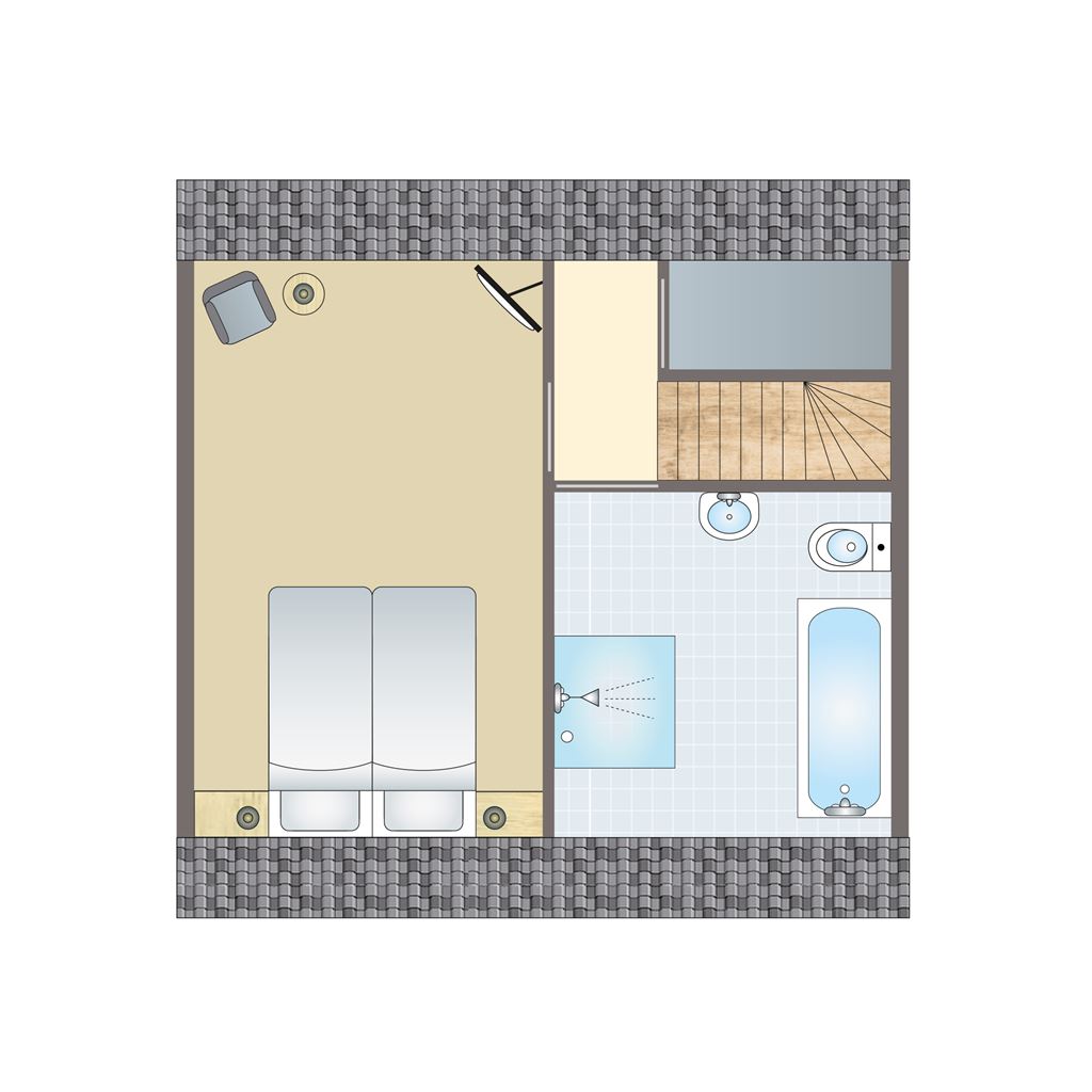 - Schlafzimmer mit zwei Einzelbetten, 2-Personen Softtopper und Flatscreen-TV auf der ersten Etage