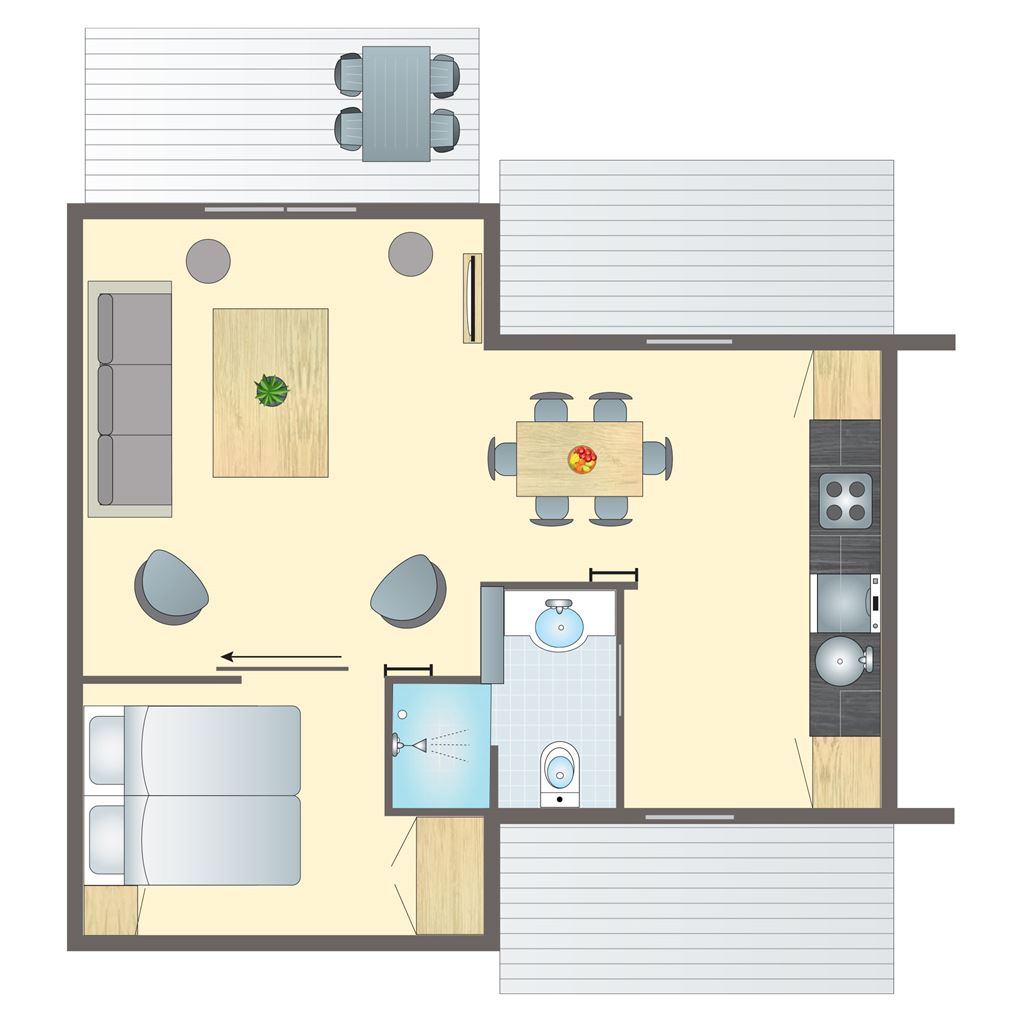 Großes Wohnzimmer und Küche mit Essecke für sechs Personen, Sofalandschaft und Flachbildfernseher. Das Ferienhaus hat eine Holzterrasse auf der Rückseite des Hauses und eine "Morgenterrasse" vor dem Haus. Von dort hat man Aussicht auf den Fjord und Livø, den Kanal oder den See. Schönes Bad mit Fußbodenheizung, Dusche, Toilette und Waschbecken. Ein mit einer Schiebetür abgetrenntes Schlafzimmer mit 3/4-Bett und zwei großen Dachböden (je ca. 5 m2) mit je zwei Matratzen. Die Ferienhäuser befinden sich in Privatbesitz, daher sind Beschreibungen, Bilder, Spezifikationen und Grundrisse der Ferienhäuser unverbindlich und können abweichen.