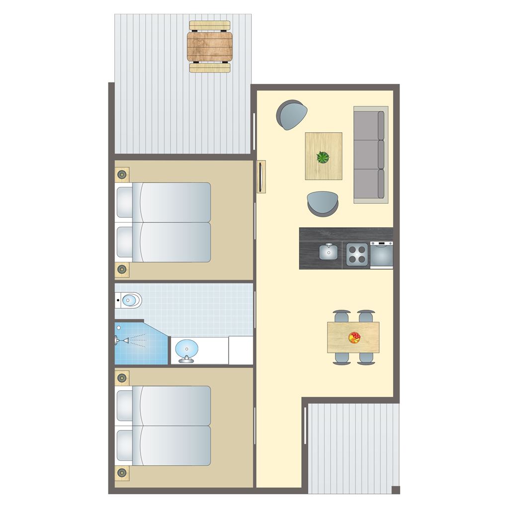Ferienhaus mit eigener, teilweise überdachter Terrasse, wo Sie alle auf den Gartenmöbeln sitzen und Ihren Urlaub gemeinsam genießen können. Das Wohnzimmer ist mit der Essküche verbunden, so dass Sie alle zusammen sind, auch wenn einige kochen und andere es sich auf dem Sofa gemütlich machen. Es gibt zwei Schlafzimmer mit je zwei Betten und einen Dachboden mit Platz für zwei Personen. Die Ferienhäuser sind in Privatbesitz, daher sind die Beschreibungen, Fotos, Spezifikationen und Grundrisse der Ferienhäuser indikativ und können variieren.
