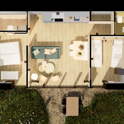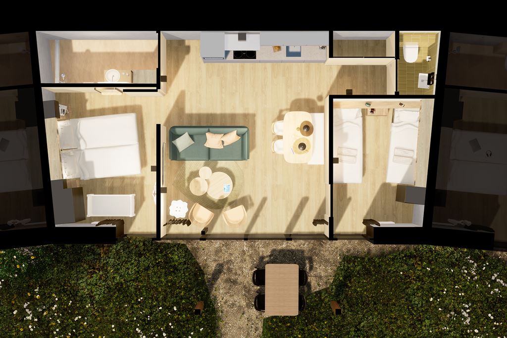 - Zwei Schlafzimmer mit jeweils zwei Boxspring-Einzelbetten