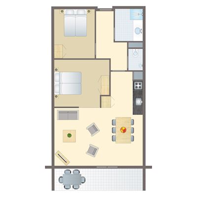 - Zwei innenliegende Schlafzimmer (ohne Fenster) mit jeweils zwei Boxspring-Einzelbetten